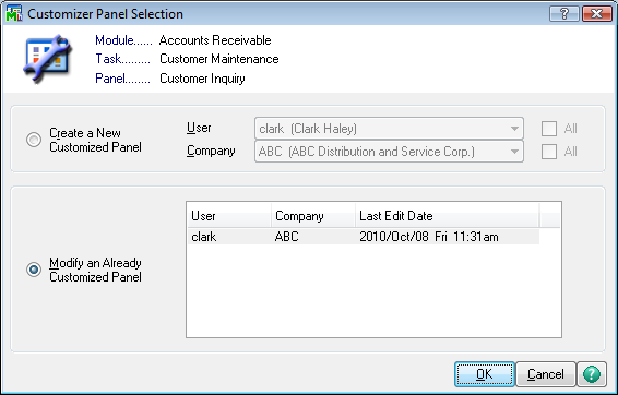 - Click “Create New Customized Panel and select the User (or security group) and company that you want to have access to this customization. Click OK to advance to the next screen. Note: If you select “All” for the User and Company, every user will see the same customized form.