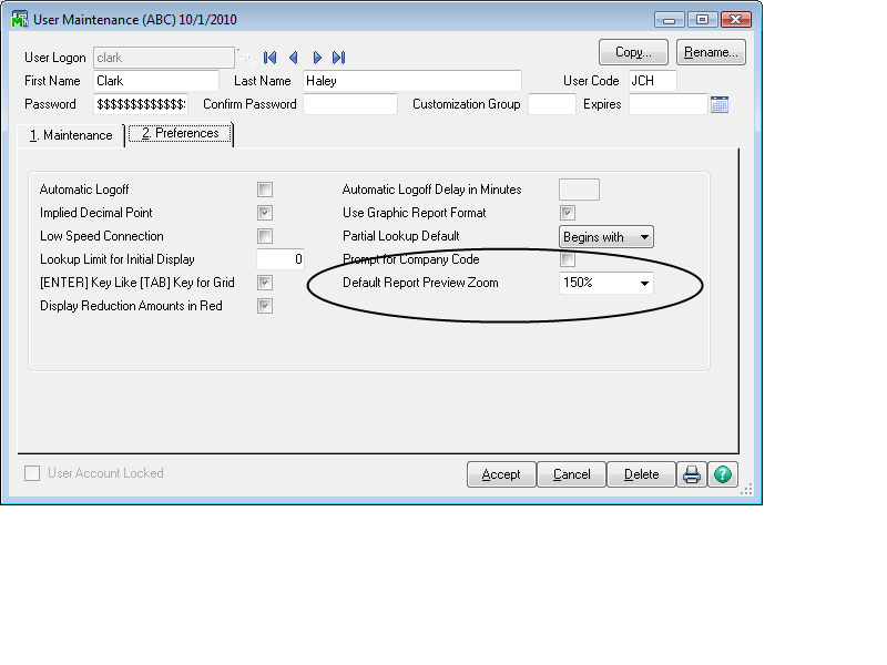 The Report Preview option will allow you to predefine, by user, what magnification level to use when viewing Crystal Reports to your computer screen. To change the setting for a user: