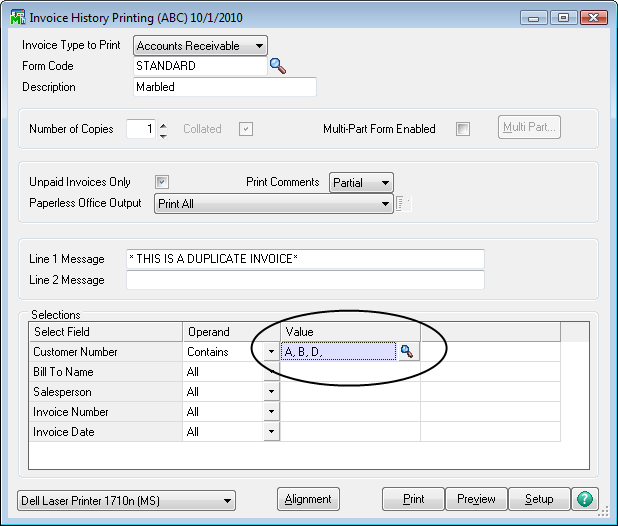 There are a number of special filters available to select data in MAS 90/200 beyond the standard ranges. For example, if you want to find all invoices in the A/R Invoice History file that are associated with Customers “A”, “B”, and “D”, but NOT customer “C”, you in the Value field, you would enter, “A,B,D,” (Make sure you put a comma on the end of the string). The result would be all invoices for Customers A, B, and D, but not C.